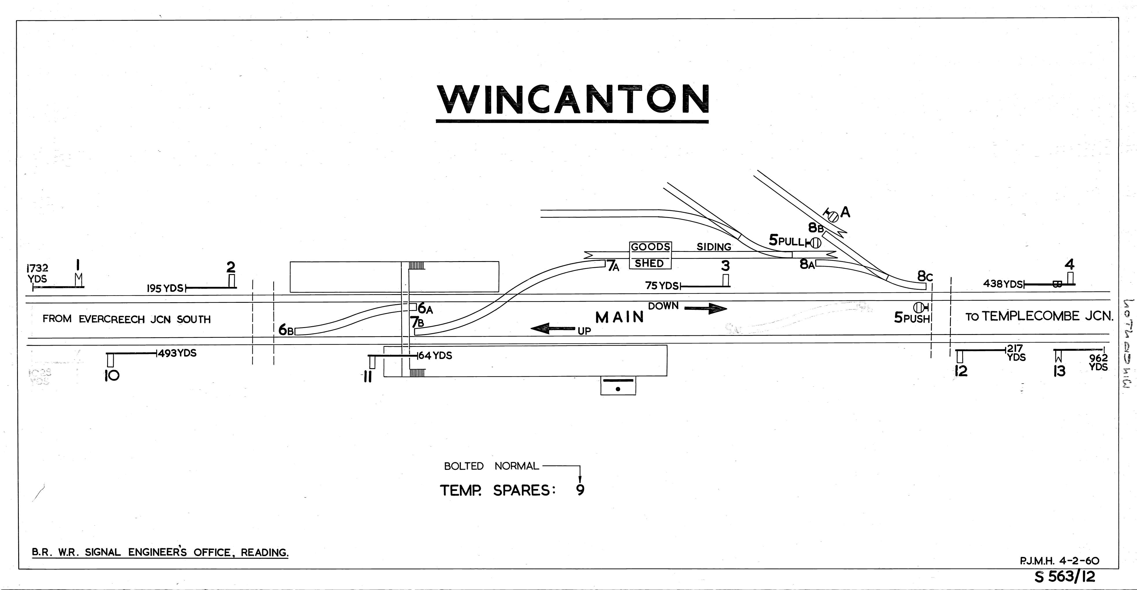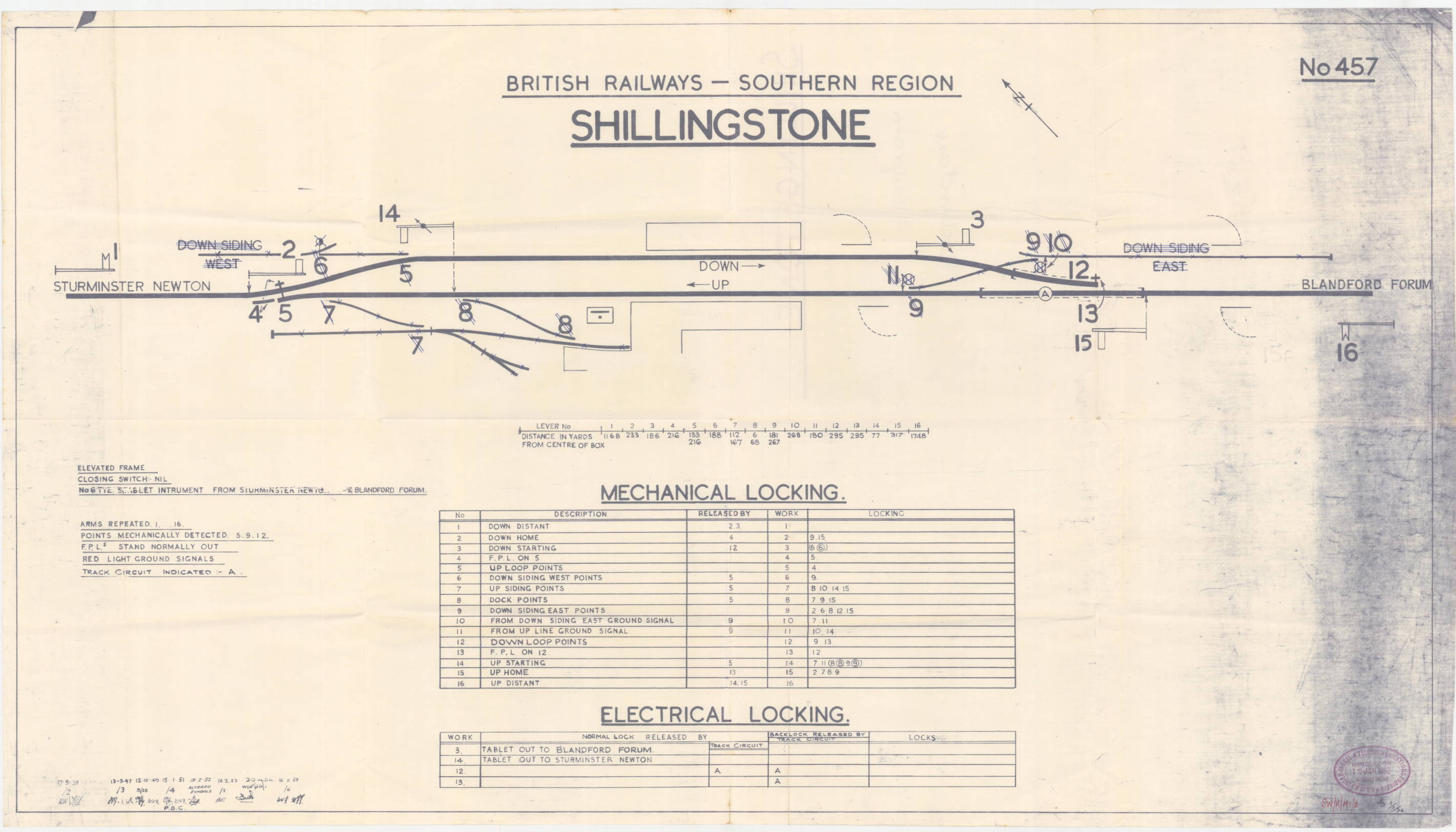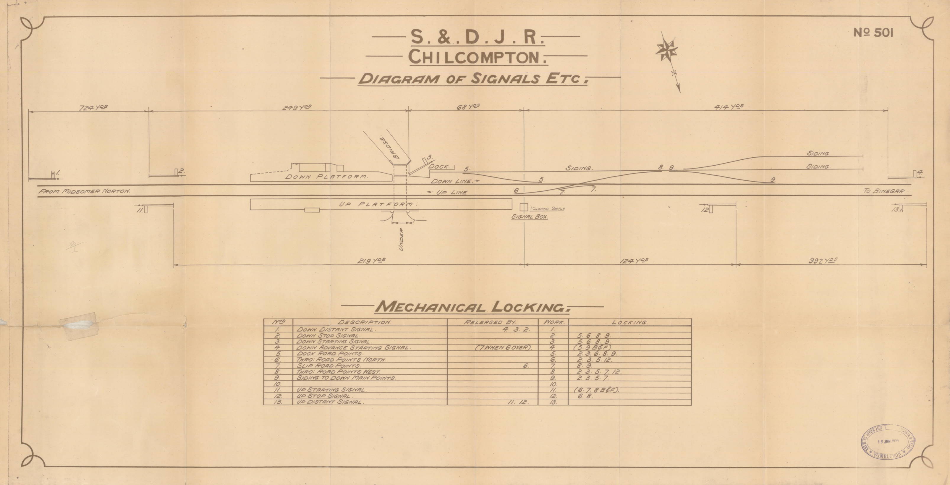 In the British Railways (BR) period some parts of the S&DJR came under the control of BR (Western Region) (BR(WR)) and various ex-S&DJR SBs and GFs became the responsibility of the Frome District of the BR(WR) Signal & Telegraph (S&T) Department. At first the S&T Department followed their Great Western Railway (GWR) predecessor's system of 'D' (Drawing) numbers and allocated new 'Dxxx' numbers to some ex-S&DJR diagrams, but in 1957 they introduced a new system of 'S' numbers [1]. Although the 'S' denoted a 'Signalling' drawing, they are often called 'stick' numbers as the 'stick' was the BR(WR) storage equivalent of the 'roller'.