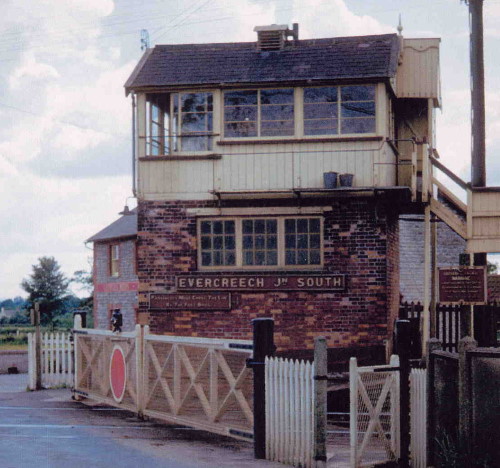 On 28-August-1852 the Somerset Central Railway (SCR) opened a single-track line from Highbridge to a terminus at Glastonbury. In 1862 the SCR merged with the Dorset Central Railway (DCR) to form the Somerset and Dorset Railway (S&DR) and in 1863 opened a continuous line to Wimborne. Evercreech station was opened in 1862 and this became Evercreech Junction in 1874 when the S&DR opened its 'Bath Extension' line from there to Bath. In 1875 the S&DR became the S&DJR when the line was leased jointly by the Midland Railway (MR) and London & South Western Railway (L&SWR). After the Grouping of the railways of Great Britain in 1923 the S&DJR remained a Joint line, but now under the control of the London, Midland & Scottish Railway (LMS) and the Southern Railway (SR), who were the successors to the MR and L&SWR respectively. The railways were nationalised in 1948 and in 1950 the Joint line west and north of Evercreech Junction came under the control of British Railways (Western Region) (BR(WR)); by mid-1958 (BR(WR)) had gained control as far south as Templecombe Junction and retained that until the S&DJR closed on 6-March-1966. There were two signal-boxes at Evercreech Junction:- the 'North' box was at the actual junction, the 'South' box was at the level-crossing next to the station.