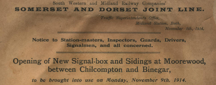 Moorewood signal-box (SB) had the distinction of being the last SB to be opened on the S&DJR at a location which previously had never had a SB, although it did supersede the small ground-frame (GF) which had controlled the existing Old Down Siding. If one disregards the re-opening in 1920 of the SB at Evercreech New (rebuilt after the previous SB had been destroyed by fire in 1919), then it was also the last completely new SB to be opened anywhere on the S&DJR. It was one of the few S&DJR SBs to be built at a location with no passenger station or junction and also one of the few S&DJR SBs to have been constructed with its lever-frame located at the rear of the box.