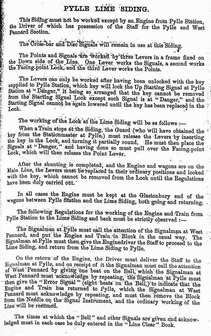 A 'shunting staff' was used at one time in connection with the working of Pylle Lime Siding, which was about half a mile west of Pylle station in the single-line section between Pylle and West Pennard. This siding is believed to have been brought into use in 1869 and it was accessed by a point facing to Down trains. It was worked by engines which would draw their train out from Pylle, shunt the siding, and then propel their train back to Pylle. By the 1880s the siding was controlled by an adjacent ground-frame and protected by one or more disc-and-crossbar signals, which stood normally 'off' when the ground-frame was locked.