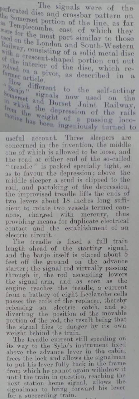 "The signals were of the perforated disc and crossbar pattern on the Somerset portion of the line, as far as Templecombe, east of which they were for the most part similar to those used on the London and South Western Railway, consisting of a solid metal disc with a crescent-shaped portion cut out of the interior of the disc, which revolved on a pivot..."