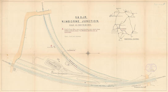 When the first part of the DCR was opened in 1860 the Southampton and Dorchester Railway was still single-track and that line was not doubled west of Wimborne until 1863, although the viaduct across the River Stour had been constructed for double-track in 1847. It is believed that the DCR was constructed with a separate line (parallel to the existing line) across the viaduct from the station, probably without any connection between them where they diverged at the south end. However it is clear that a physical junction was provided eventually, as the Board of Trade (BoT) Inspection Report for the 1863 doubling mentions a 'signal box' at the 'junction'. Nothing more is known about that 'signal box', but it may have been little more than a small hut to provide shelter for the signalman, with a very primitive signalling infrastructure.
