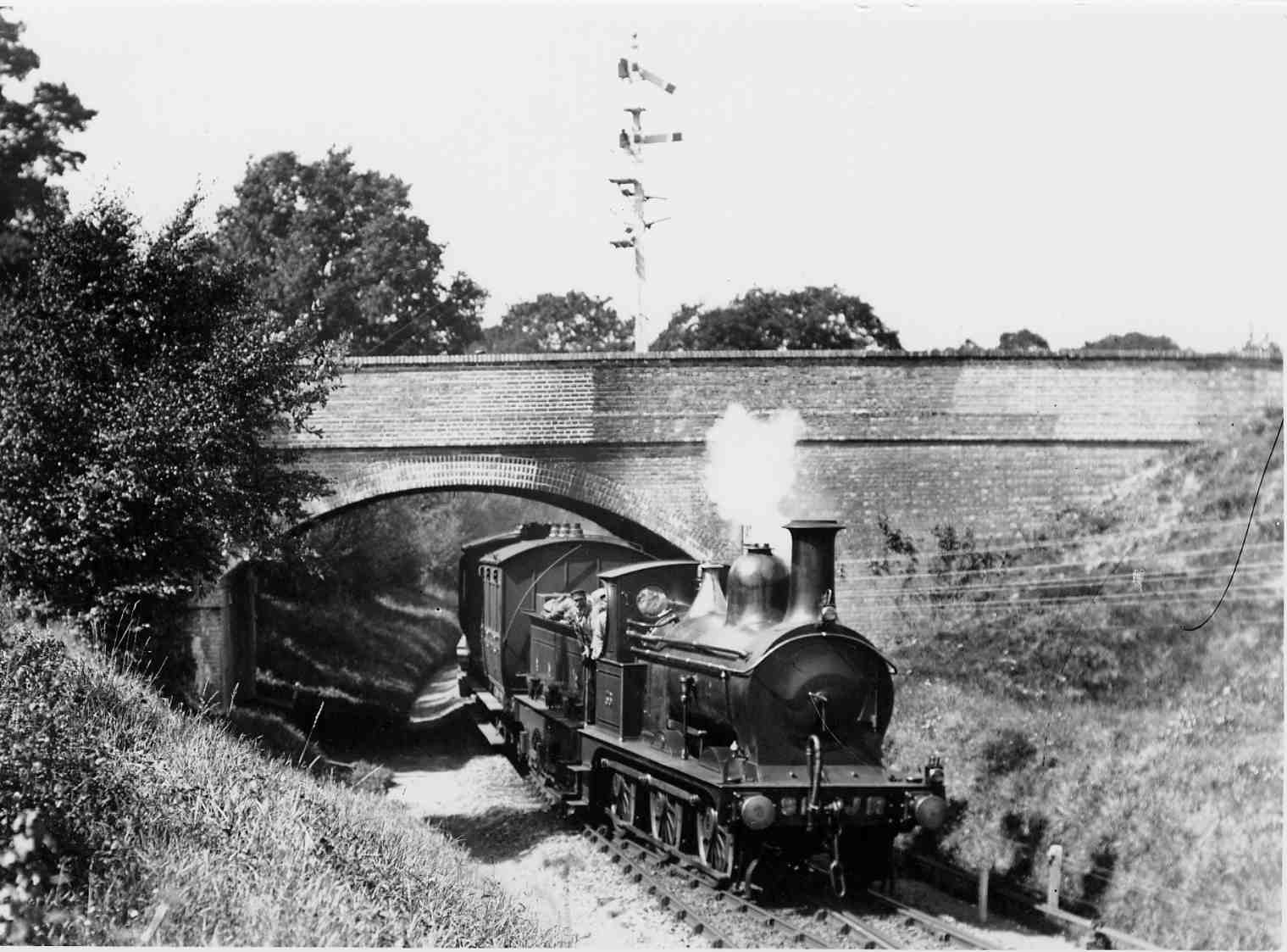 In 1872 the L&SWR opened a signal-box at Wimborne Junction, but few details are known about that box or its signalling installation. The actual junction was double-track, but the S&DJR line became single track after a short distance along the branch. However in 1878 the double-track on the branch was extended further from the junction and the S&DJR opened their own signal-box to control the point where that double-track became single-track. The new work was inspected for the BoT by Col Yolland and his Report is dated 18-April-1878 (The National Archives (TNA) file MT6/205/10). He stated that the new signal-box contained an interlocking frame with 9 levers, of which one was spare at that time, although associated plan evidence would suggest that the spare lever was brought into use almost immediately afterwards. There is only one known photograph of this signal-box, of which sadly only the roof and valancing are visible above a passing train, but it would appear to have been to the contemporary S&DJR Type 1 style.