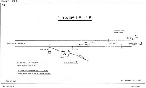 [Note: some sources state that Downside Siding GF was released by a key from Winsor Hill SB, but it is considered that this is probably a mis-interpretation of the need for the GF operator to obtain keys for the locks on the bell box and hut door at Downside Siding; those keys did not unlock the actual GF lever-frame. Details of the Sykes instrument release are taken from official S&DJR records and accord with contemporary practice for such locations.]