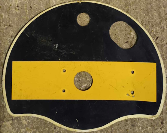 It is a little unclear as to what further changes may have taken place during British Railways days, particular after much of the northern part of the line was taken over by BR(Western Region). A signal diagram for Glastonbury in the 1960s shows that ground signal 27 there had been converted to 'yellow' form at an unknown date (probably after closure of the Wells Branch in 1951). There is a reference also to yellow ground signals at Evercreech Junction South in a diagram for the 1960s, but photographic evidence (albeit black-and-white) does not seem to confirm this. Signal 17PULL at Blandford appears in the background of Plate 66 in Middleton Press's "Bournemouth to Evercreech Junction" book; that photograph is dated 13-August-1965 and the signal was still of the 'miniature semaphore' type at that time. However it should be noted that a yellow/black 'half-disc' face-plate was recovered privately from Blandford in 1969 (as seen here), although its precise origin is unknown.