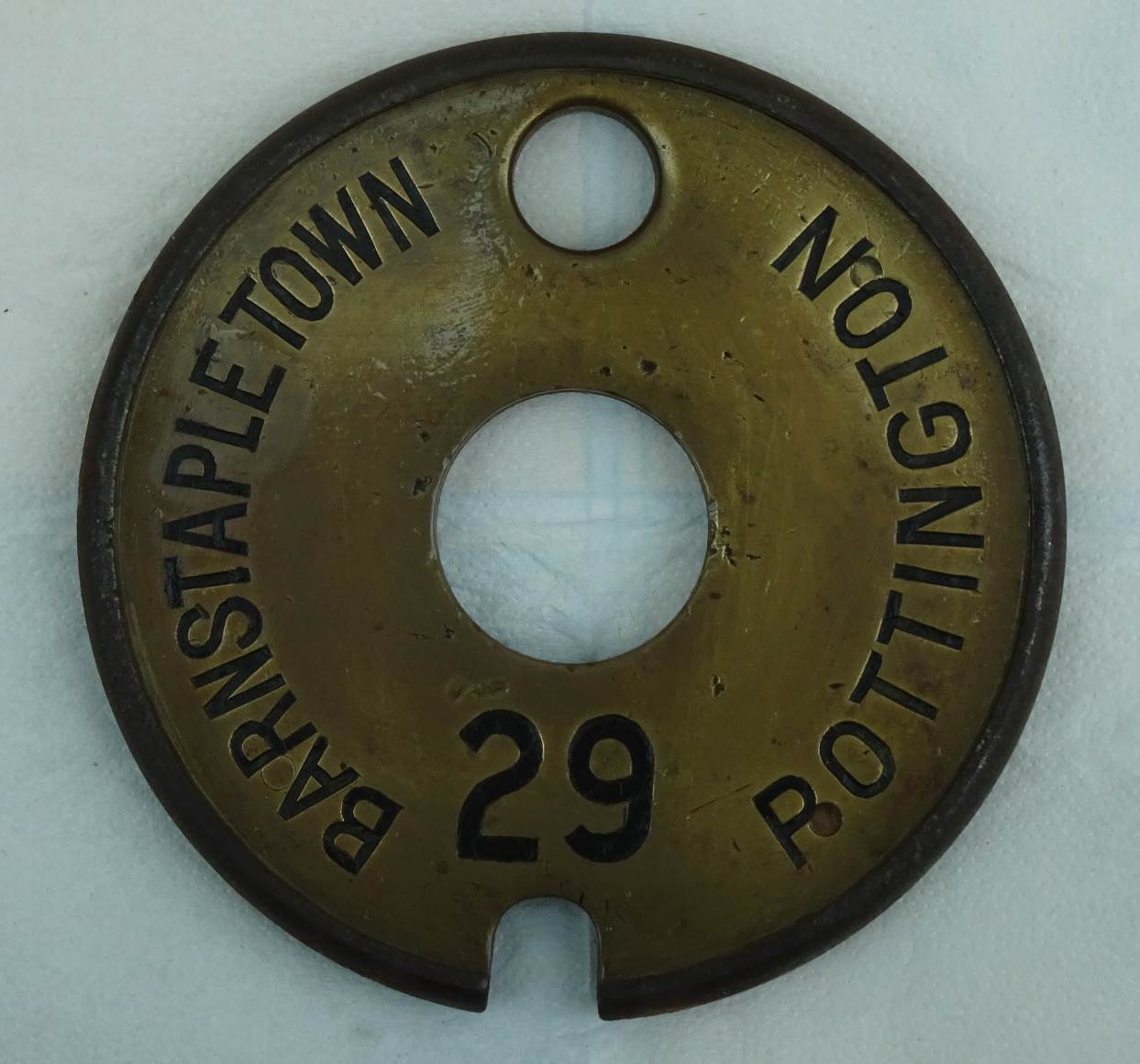 In 1890 block working on the single-line Barnstaple Jcn West - Pottington section was by TS&T with a round red staff, but during the mid-1890s that was replaced by the Electric Train Tablet (ETT) system using Tyer's No 3 pattern instruments; it is believed, but not yet confirmed, that the change took place during 1895 (L&SWR Instruction 29/1895). The opening of the new Barnstaple Town signal-box in 1898 divided that section into two new sections Barnstaple Jcn West - Barnstaple Town - Pottington, both worked by No 3 ETT instruments. (It is probable that the instruments from the former Barnstaple Jcn West - Pottington section were re-used with new tablets for one of the new sections.) On 2-January-1910 (L&SWR Instruction 2/1910) the No 3 instruments on the Barnstaple Jcn West - Barnstaple Town section were replaced by the No 6 pattern with 'B' configuration tablets, although it is probable that these were the original tablets for that section as the same pattern of tablet fits both No 3 and No 6 instruments. The Barnstaple Town - Pottington section had 'A' configuration tablets.