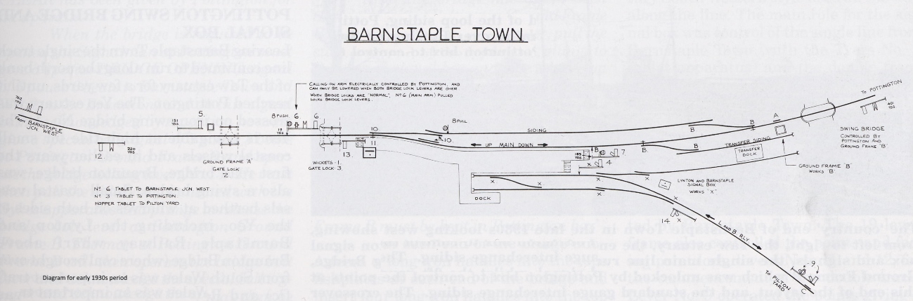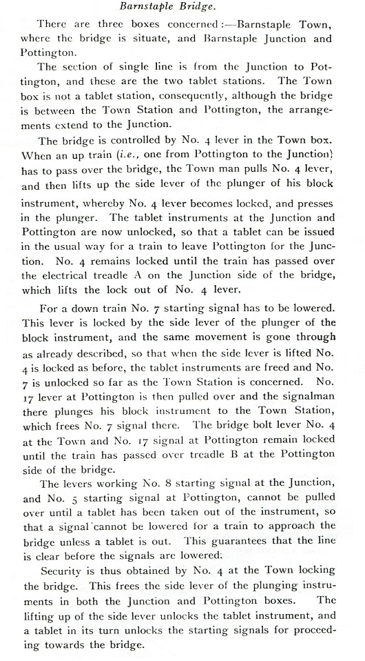 Block Working. When Pottington SB was opened in 1890 block working on the new Barnstaple Jcn West - Pottington block section was by TS&T (with a round red staff), but this was changed to ETT using Tyer's No 3 instruments in due course (probably in 1895 as described above). With the opening of the new Barnstaple Town SB in 1898 the ETT section was split then into two new sections Barnstaple Jcn West - Barnstaple Town - Pottington and the latter section was now worked by Tyer's No 3 instruments with 'A' configuration tablets. There was some Sykes interlocking provided with the ETT instrument to prevent acceptance of Down trains from Barnstaple Town when the swing-bridge was unlocked.
