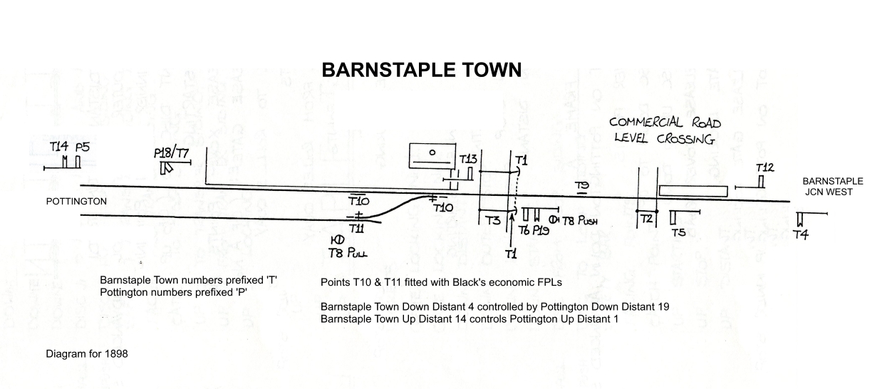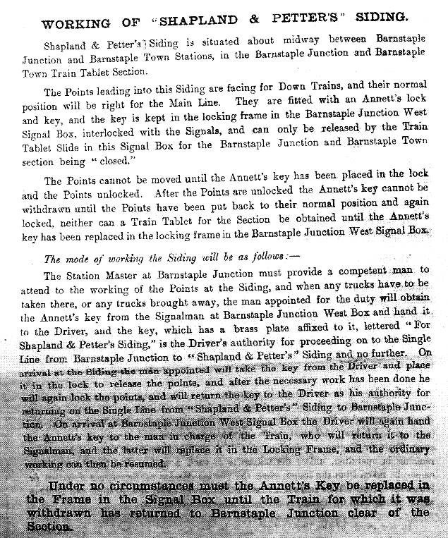 Shapland & Petter's Siding. In May 1890 a new siding was opened south of the River Taw bridge to serve the Shapland & Petter works (sited on the Down side of the line with a connection facing to Down trains). Although not directly related to the signalling at Barnstaple Quay, the BoT Inspection Report recorded that the GF at the new siding was unlocked by a key on the train staff (for the Barnstaple Jcn West - Braunton section). With the opening of Pottington SB in August 1890 and the doubling of the line to Braunton the single-line section was reduced to just the part from Barnstaple Jcn West to Pottington, but it continued to be worked by TS&T (L&SWR Instruction 84/1892). However after TS&T on the Barnstaple Jcn West - Pottington section was replaced by ETT probably (as described above) in 1895 the GF was unlocked by an Annetts' Key which was kept in the lever-frame at Barnstaple Jcn West box; this acted as a form of 'train staff' to authorise trains to proceed into the single-line section only as far as the siding and then return to the Junction, hence avoiding the need to withdraw a tablet from the 'non returnable' No 3 ETT instrument. Click here to read the instructions for working the siding which were issued in 1898 in conjunction with the opening of the new Barnstaple Town box (extracted from L&SWR Instruction 118/1898). This arrangement continued until the No 3 ETT instruments were replaced by the No 6 pattern on 2-January-1910, after which the GF was unlocked by the tablet.