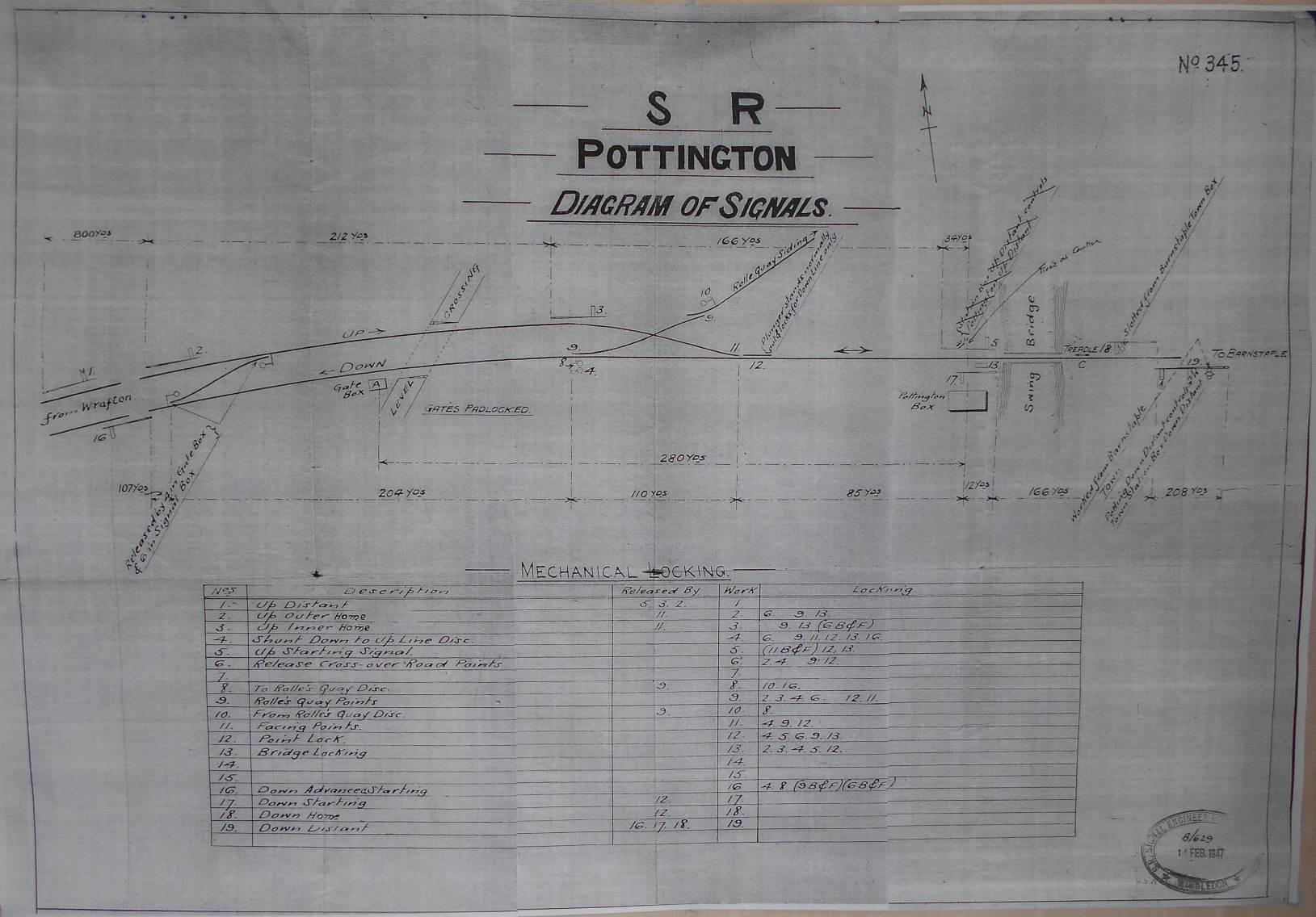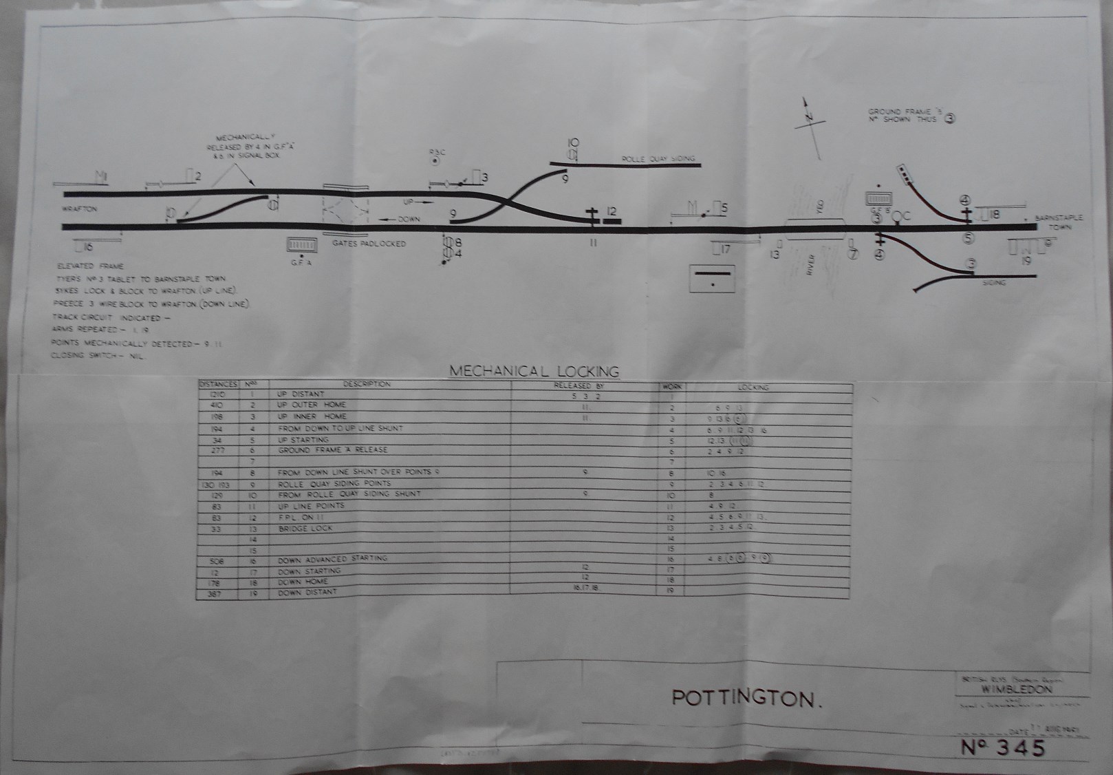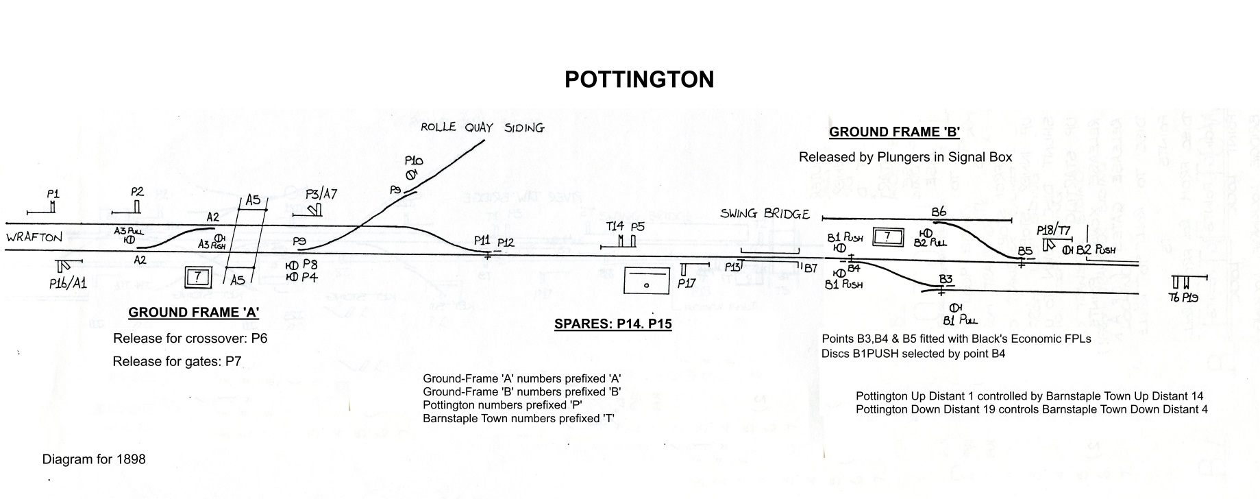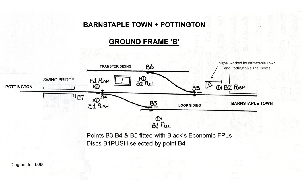1890 Installation. In 1890 Pottington was provided with a L&SWR Type 3B signal-box, with a timber superstructure on a stone base, which contained a 19-lever Stevens-pattern interlocking frame. It stood on the Down side of the line immediately west of the swing-bridge over the River Yeo, and it was opened on 4-August-1890 in conjunction with the doubling of the line from there to Braunton. The points for the single-to-double connection were located a short distance west of the SB, beyond which the access to Rolle Quay siding was altered to pass across the Up line by a diamond crossing and then trail into the Down line. Further down the line there was a level-crossing (for access to the foreshore of the River Taw), which was controlled by an adjacent ground-frame (later known as GF 'A'), and beyond that was a crossover also controlled by the GF. The GF had a 6-lever ground-level frame housed in a ground-level hut (similar to the L&SWR Type 3B style) located on the Down side of the line immediately on the west side of the level-crossing. It is unfortunate that there is no known signal diagram for 1890, but it is considered unlikely to have been very much different for the installation shown in the later 1898 diagram (except that GF 'B' did not exist yet). The new work was inspected for the BoT by Maj Gen Hutchinson and in his Report dated 21-August-1890 he requested that "No 4 semaphore signal at Pottington should be replaced by a ground disc", which would suggest that originally signal 4 had been provided as some form of main running signal. He asked also that there should be electrical interlocking to prevent the signalman from accepting a train from Wrafton when the swing-bridge was open, in the same way that existed already to prevent acceptance from Barnstaple Town (the former Quay box).