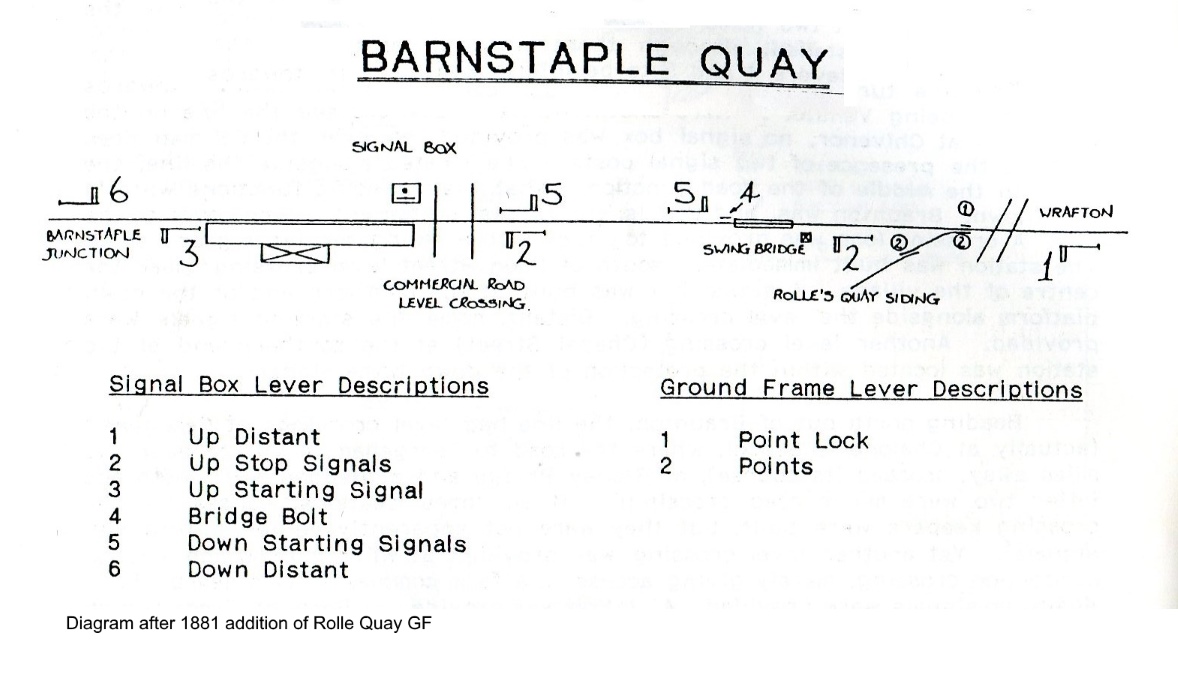 Rolle Quay Siding. In 1881 a siding was added on the Up side of the line west of the swing-bridge to serve Rolle Quay, the connection to the single line facing Up trains and worked from an adjacent 2-lever ground-frame (GF); a diagram for the new arrangements can be seen here. [Note: the drawing in the BoT file did not show V-notches in the ends of the distant signal arms.] The new GF was fitted with two Annett's locks, one unlocked by a key on the Barnstaple Jcn West - Braunton train staff and the other by a key from Barnstaple Quay SB (its removal from a lock in the SB locked the relevant signals). Although the new work appears not to have been inspected by the BoT until the 11th March that year, the L&SWR issued Instruction 36/1881 for the opening of the new connection on 23rd February, from which the following is an extract of the method of working:-