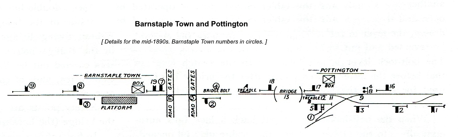 [Note: L&SWR Instruction 84/1892 provided information about the TS&T working on the Barnstaple Jcn - Pottington section. L&SWR Instruction 118/1898 dealt with the opening of the new Barnstaple Town station and signal-box and the two new single-line sections. It is curious that in both Instructions the Pottington location is described specifically as 'Pottington Level Crossing' but it unclear what, if any, significance should be given to that fact.]