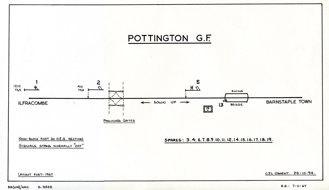 Later Alterations. At some unknown date the 'slots' worked by levers 1 and 7 in GF 'A' (on Pottington's Up Inner Home (3) and Down Advanced Starting (16) respectively) were abolished. Also at an unknown date the level-crossing gates were disconnected from the GF and simply padlocked across the roadway, with the result that Pottington lever 7 then became a spare. It is not known if both those changes occured concurrently, or at different times, but certainly they had taken place by 1947. On 24-January-1965 GF 'A' and its crossover points were taken out-of-use and its discs recovered (BR(WR) Weekly Notice K2/3/65).
