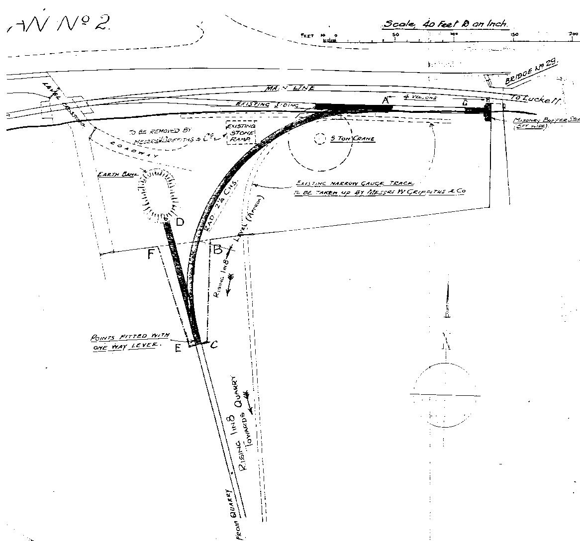 Kit Hill. This siding was on the Down side of the line with a connection facing to Up trains. The siding was served originally by a 3'6" narrow-gauge tramway, which rose about 300' by means of a rope-worked incline to a quarry on the top of Kit Hill. In 1940 the quarry owners William Griffiths & Co reached an agreement with the Southern Railway to convert the tramway to 4'8½" standard-gauge and connect it directly into the siding. Because the incline descended at 1-in-5 to 1-in-8 almost at right-angles to the main railway line and the adjacent road below, a catch siding was constructed at the bottom leading to a huge earth bank as a safeguard against any runaway wagons. Click here to see a copy of a plan of the alterations. The siding was taken out of use on 21-December-1954.