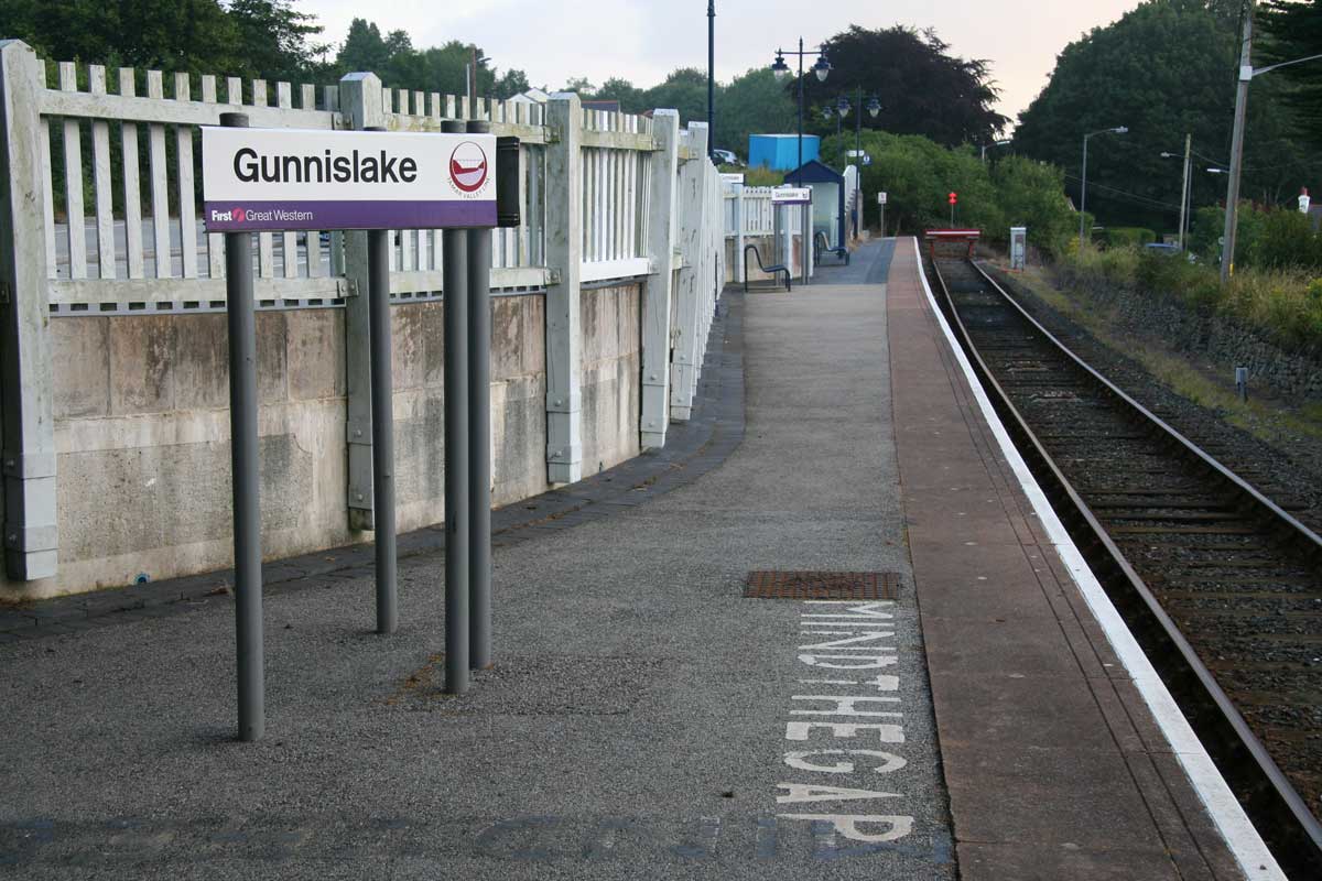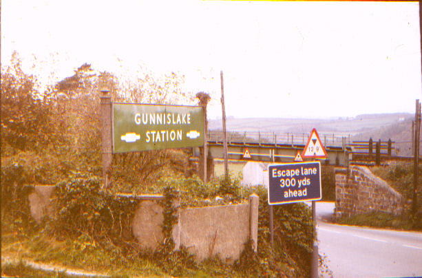 GUNNISLAKE. This station was the only passing place on the line and unusually it had an island platform between the loops, with pedestrian access via a subway under the Down loop at the Calstock end. The station was situated a short distance to the west of the main A390 road, which it crossed by a girder bridge whose low headroom was a source of trouble to road traffic for many years. There was a goods yard on the Down side, which was served by a siding adjacent to the Down Loop accessed by a trailing connection at the Callington end. There were another two sidings at the back of the yard, which had a separate connection from the single line side at the Callington end of the station, just at the spot where a minor road crossed the line by a small girder over-bridge.
