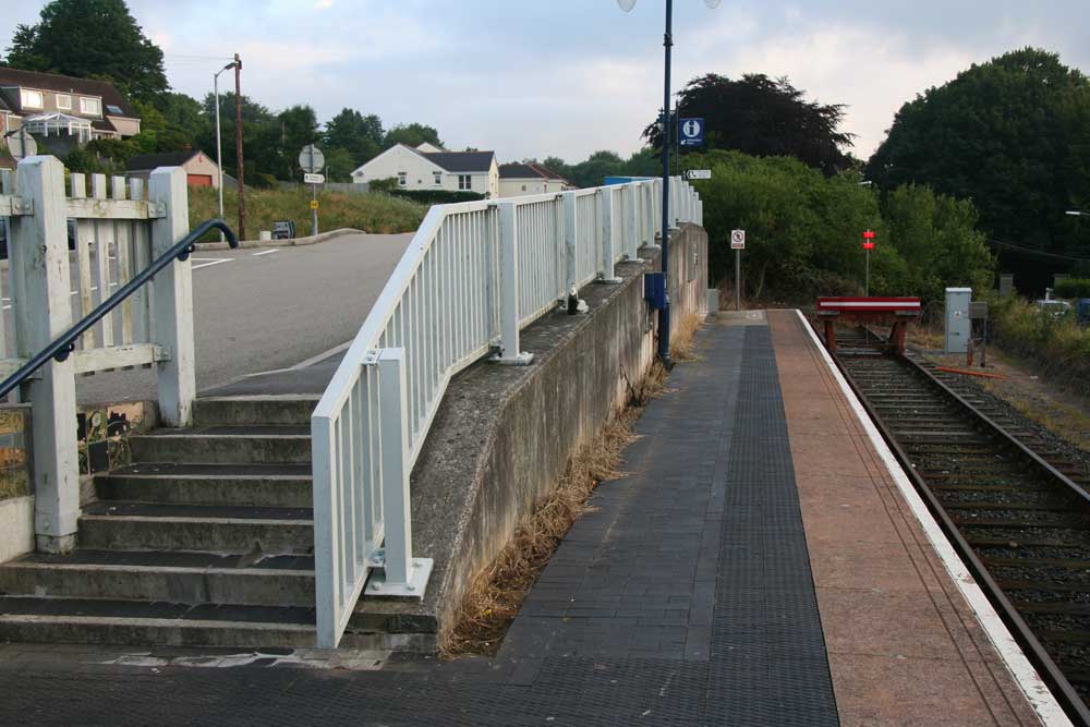 This relocation of the station enabled the removal of the railway bridge over the A390 road, whose low headroom had been a source of trouble to road users for many years. It became possible also then to lower the trackbed a little at the approach to Gunnislake and thereby ease the gradient, as the line no longer had to rise to cross the road-bridge. The new Gunnislake station has a single platform 354' long on the down side of the line, which now terminates at a friction stop-block just to the east of the A390 road at 4m 40ch. The site of the old station was redeveloped for housing in 2003.