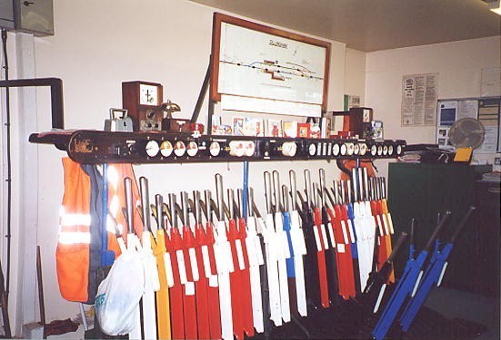 Although both the Wilton and Tisbury Loop areas are controlled now by the same panel at Salisbury the single-line section between them is worked still by tokenless block (presumably to save the cost of track-circuiting through the section). The result is the curious situation whereby the Salisbury signalman has to offer to himself, and give himself acceptance, for a train passing through that section using switches only a few inches apart on the same panel! Click here to see the relevant part of the panel (120KB). Tokenless block working is in force also for the section from Tisbury Loop to Gillingham. In addition a 'closing switch' for the Tisbury Loop is provided at the Salisbury panel, enabling the signalman there to work a single section from Wilton to Gillingham as required.