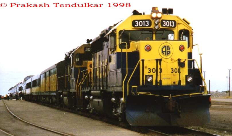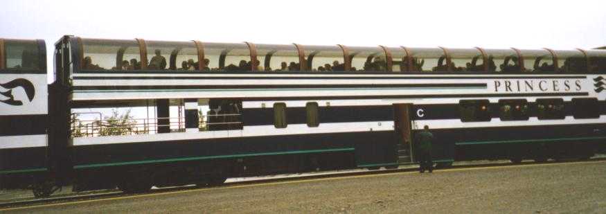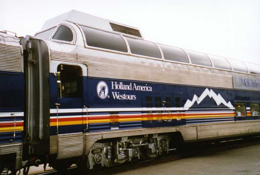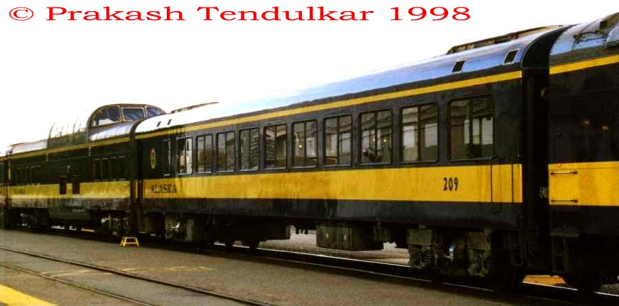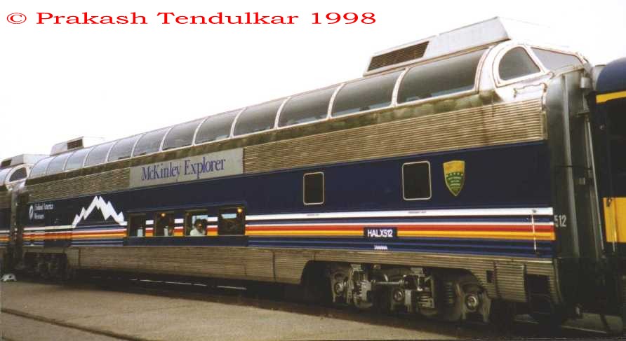 On the next day, Denali Express was hauled by a pair of GP40-2 locos in customary yellow and blue livery of ARR. Mt. McKinley has been renamed as "Denali" or "The Big One" as known to Indians. Newer dome cars with observation deck. Holland America Westours! ARR cars with a dome car in the middle......