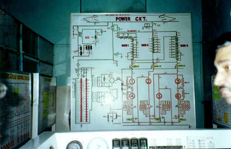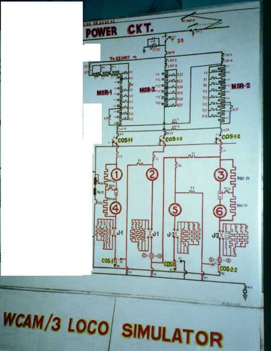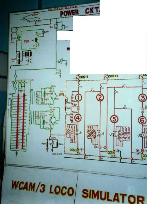 Before we start, we need to change our paradigm about Simulators. WCAM3 Simulator is fully functional and practical, is designed for teaching loco staff who may not have EE background, is not designed for fun like MS Train Simulator. The main panel is located at the center. WCAM3 is a dual voltage (1.5 KV DC and 25 KV AC) locomotive designed and manufactured by BHEL. WCAG1 is a direct derivative of WCAM3, shares most of the components with it and has minor differences like gear ratio and starting torque. For those who may not be familiar, although made by BHEL, Jhansi, WCAM2 is in fact, a siblings of WCAM1 rather than WCAM3, inside a new shell. They share the same TAO659 Traction motors from BHEL rated at 3640 HP in AC and 2940 HP in DC mode. It is not surprising because Western Railway, its' sole user, has less than 60 kms. of DC track which is leveled and therefore, this loco does not require capability to negotiate incline in Ghats. WCAM3 and WCAG1 use HS15250A Traction motors by BHEL that deliver 5000 HP in AC and 4600 HP in DC mode. On the other hand, WCAM2P hauls super fast trains like Rajdhani and hence has maximum speed of 120 kms/h compared to 105 kms/h for WCAM3 that hauls only Shatabdis. This is achieved by a gear ratio of 21:58 for WCAM2P against 16:61 for WCAM2. Some WCAM1 units are re-geared for 21:58 against original 16:61 ratio. In AC mode, WCAM3 and WCAM2 but not in WCAM1, Traction Motors are permanently wired for 2S-3P combination and there is no transition. WCAM1 uses transitions of 3S-2P & 2S-3P combinations in AC mode. In DC mode, the motors transit in 6S, 3S-2P and 2S-3P combinations for WCAM3, 6S and 3S-2P for WCAM1 and WCAM2. The main panel in Simulator is, therefore, devoted to AC and DC circuits for Traction Motors and is flanked on both sides by other panels describing supplementary circuits. All these panels are equipped with LEDs that light up to show the circuit activated by an instructor, including minor details like resistors. The Simulator has front panel layout as can be seen in WCAM3, ammeters, voltmeters, and few other gauges. Now the hard part. All the circuits are activated by one or more toggle switches and the gauges are not activated at all. To be honest, both of us were kind of disappointed initially but when I consider the lowest possible level of audience that may attend the sessions, I think it is a great simulator used for education and not entertainment. I have edited images to show AC and DC circuits separately. In another room where working model of WCM5 is located, is another simulator. It contains a cut out of WCG2 cab (a real one and not card board box) with master controller and gauges. As one operates master controller, circuit shown in front panel reflects changes. This simulator, is however, limited to DC mode only. On separate desks, are brake controller with air compressor (to simulate air brakes) and other sundry equipments like traction motor. This offers a hands on experience to "would be" drivers, although I am certain all of them had a real experience gained clandestinely during night trips. |