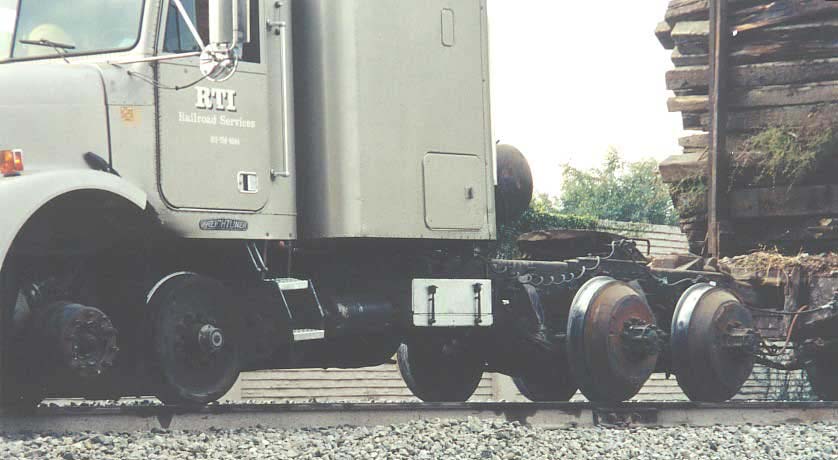 The last phase is clean up. Another truck hauling a flat car to collect discarded wooden ties.