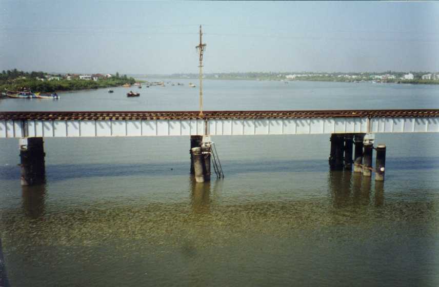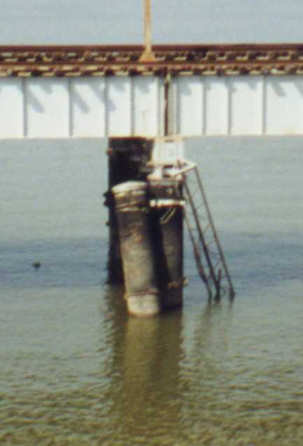 Many pillars of Old Vasai Creek were damaged or broken due to accidents with fishing trawlers, ageing or during trials with double WDM2 headed Rajdhani Express. Supports were added as a remedy but they too were victims of salty water. For enlarged picture, please click here. © Prakash Tendulkar 2001 |