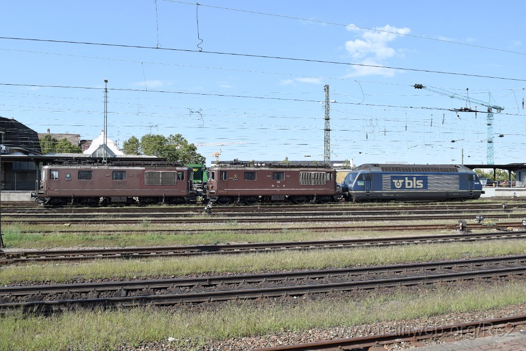 | BLSC Re 4/4 172 (Re 425.172-4) ''Eggerberg'' (91 85 4 425 172-4 CH-BLSC) + BLSC Re 4/4 180 (Re 425.180-7) ''Ville de Neuchâtel'' (91 85 4 425 180-7 CH-BLSC) + BLS Re 465.011-5 ''Wiesenberg'' (Re 91 85 4 465 011-5 CH-BLS) / Basel Badische Bahnhof 31.8.2015 | 3665-0046-310815 | |