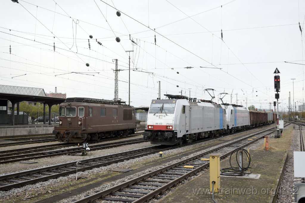 | BLSC Re 4/4 182 (Re 425.182-3) ''Kandergrund'' (91 85 4 425 182-3 CH-BLSC) + RailPool 186.452-9 (91 80 6 186 452-9 D-Rpool) + RailPool 186.491-7 (91 80 6 186 491-7 D-Rpool) / Basel Badische Bahnhof 23.10.2023 | 8855-0015-231023 | |