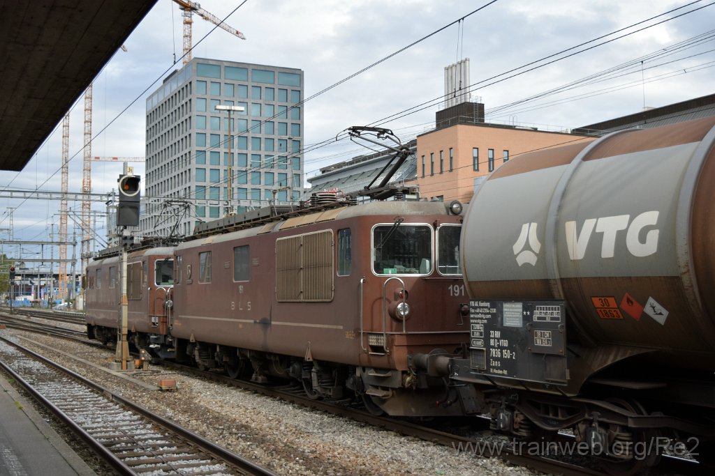 | BLSC Re 4/4 170 (Re 425.170-8) ''Brig-Glis'' (91 85 4 425 170-8 CH-BLSC) + BLSC Re 4/4 191 (Re 425.191-4) ''Reichenbach'' (91 85 4 425 191-4 CH-BLSC) / Zürich-Altstetten 16.9.2016 | 4145-0007-160916 | |