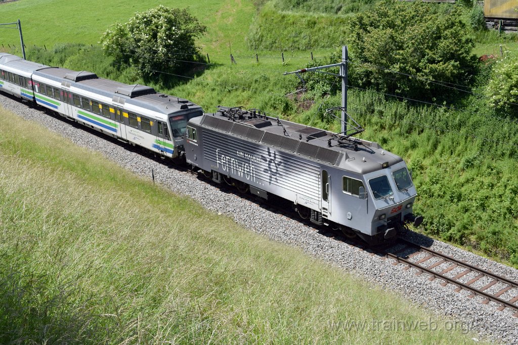 | SOB Re 446.017-6 ''Ein Hauch Sehnsucht'' (Re 91 85 4 446 017-6 CH-SOB) / Kaltbrunn (Brücke Sigristenackerstrasse) 10.6.2016 | 3961-0016-100616 | |