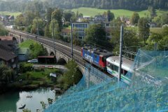Arth-Goldau - Rothenthurm en cas de rajout de voitures supplémentaires. Depuis décembre 2013 (Nouveau concept de traction avec un véhicule moteur à chaque extrémité du train), les Re 4/4" ou Re 421 ne sont plus engagées régulièrement sur le Voralpen-Express, mais sont louées par le SOB en cas d'indisponibilité de leur propre matériel moteur. A partir de 2020, les rames actuelles seront remplacées par des automotrices Stadler type "Flirt IC". |