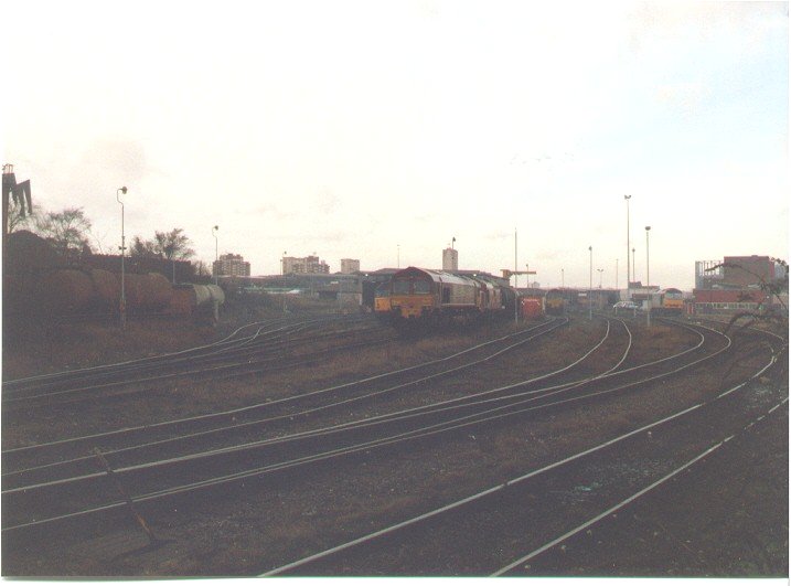 The photograph below is the view of Saltley TMD taken from the 'Duddeston Mill' trading estate taken December 1999 by Matthew Kitchin. The shed is behind the class 66 nearest the camera and the driver's mess is on the right of the picture. Click on the picture for a larger view.