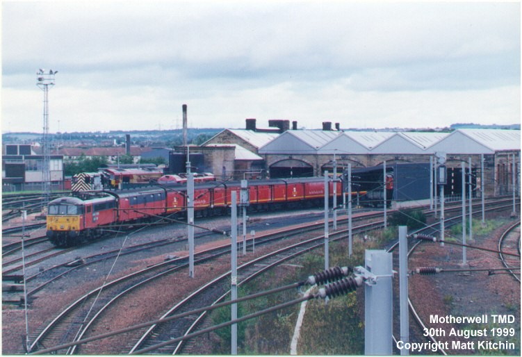 The picture below was taken from the road overbridge over the railway line to Coatbridge. The main shed can be seen in the view with the staff buildings in the background to the left. Just out of sight to the left is a group of sidings used to stable locomotives. The DIY shop car park is out of view to the left. Click on the photo for a larger view. Photo by Matthew Kitchin taken on 30th August 1999.