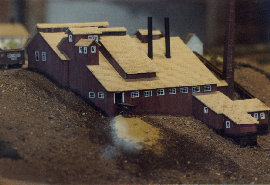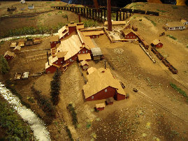 The mill in the center of the above photograph, is the main mill for the Holden Lixivation Works. The building in the lower center is the refinery, where the processed ore was removed from the sodium cyanide, bagged and shipped to a smelter, much like the Aspen Smelting Company, located across Castle Creek. The building to the right of the smokestack is the Sampling House. This building is still standing and houses the diorama today.