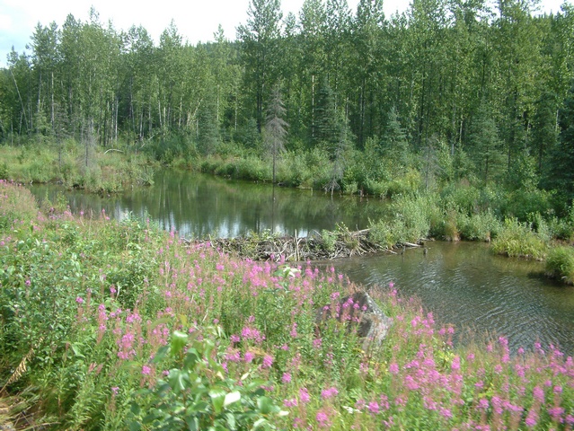 railroad, another river is nearby with a beaver dam.