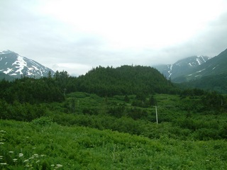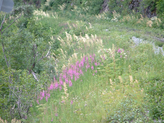 The violet colored flora is Alaskan Fireweed and the yellow is Goat's