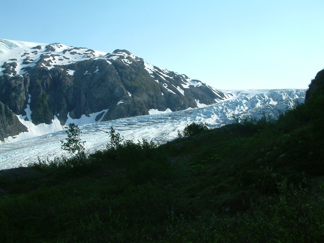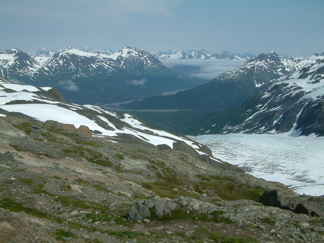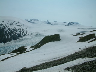 Below left, looking down at Exit Glacier leaving the Harding