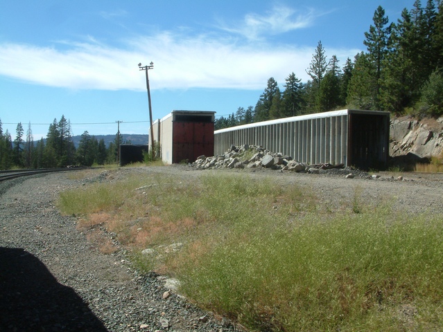 eastern portal of the tunnel. Across the valley, a snowshed and