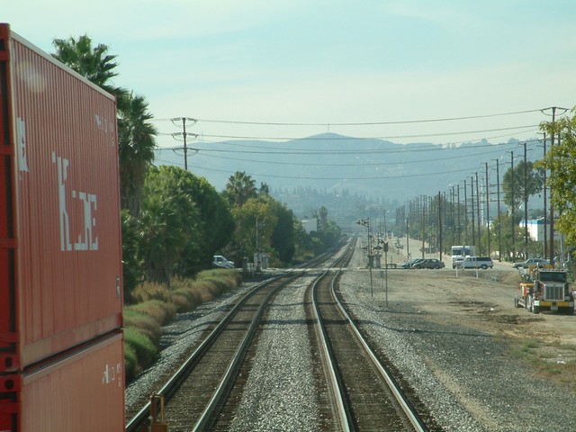 Fairway Drive and Nogales street, an eastbound container train