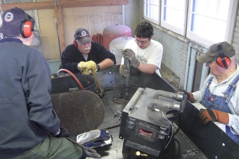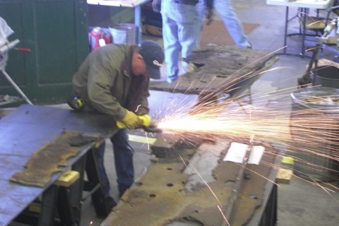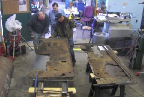 Work on the tender is nearing completion to the point that we will be ready to have the inside of the tank coated. Today’s work, April 28, 2012, involved riveting the drain pipe plates to the deck. Also Andy Anderson is preparing the new cab flooring steel plates using the remains of the original rusted floor as a template.