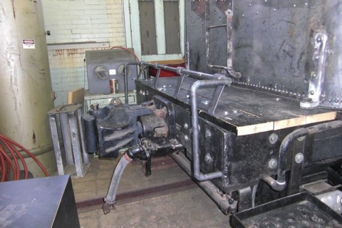 Restoration crew members Bob Wachs and Richard Carroll fashioning a couple lift bar for the rear of the 223 tender based on photos of the original equipment when in service. It was missing from the old tender when it was acquired by the museum.