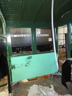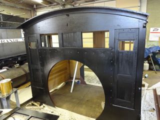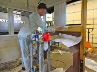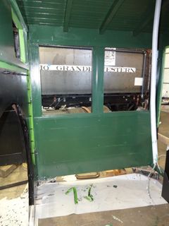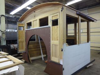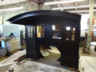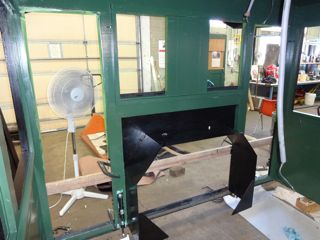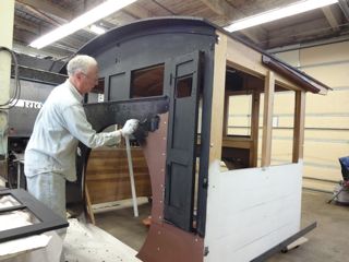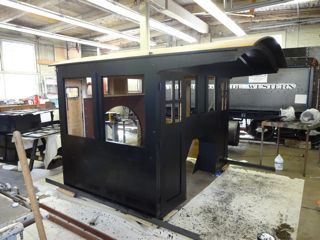 Maynard assigned Lee Witten (a very non-professional painter) the task of painting the 223 cab. Some felt it a shame to cover up the nice woodwork but historical accuracy dictated it. Lee painted the outside with a flat finish black then applied a coat of satin polyurathane to give it a semi gloss. Lee chose a light green for the interior but Maynard found a wooden structure from the original cab which shows a much darker green. A local Ogden paint store, Weber Paint and Glass, was able to match the original green very closely. Lee grew to know the interior of the cab well having painted it three times....primer, erroneous light green, correct dark green.