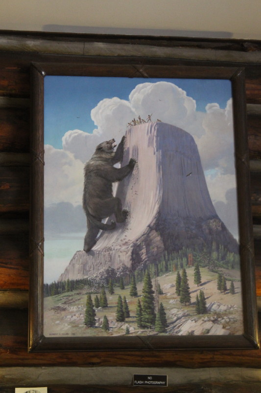 Another version tells that two Sioux boys wandered far from their village when Mato the bear, a huge creature that had claws the size of tipi poles, spotted them, and wanted to eat them for breakfast. He was almost upon them when the boys prayed to Wakan Tanka the Creator to help them. They rose up on a huge rock, while Mato tried to get up from every side, leaving huge scratch marks as he did. Finally, he sauntered off, disappointed and discouraged. The bear came to rest east of the Black Hills at what is now Bear Butte. Wanblee, the eagle, helped the boys off the rock and back to their village. A painting depicting this legend by artist Herbert A. Collins hangs over the fireplace in the visitor's center at Devils Tower.
