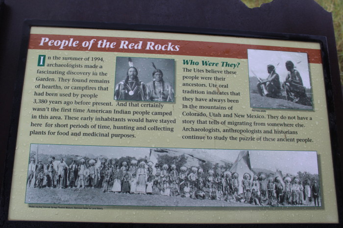 HistoryThe Garden of the Gods' red rock formations were created during a geological upheaval along a natural fault millions of years ago. Archaeological evidence shows that prehistoric people visited Garden of the Gods about 1330 BC. At about 250 BC, Native American people camped in the park; they are believed to have been attracted to wildlife and plant life in the area and used overhangs created by the rocks for shelter. There are many native peoples who have reported a connection to Garden of the Gods, including Apache, Cheyenne, Comanche, Kiowa, Lakota, Pawnee, Shoshone, and Ute people.