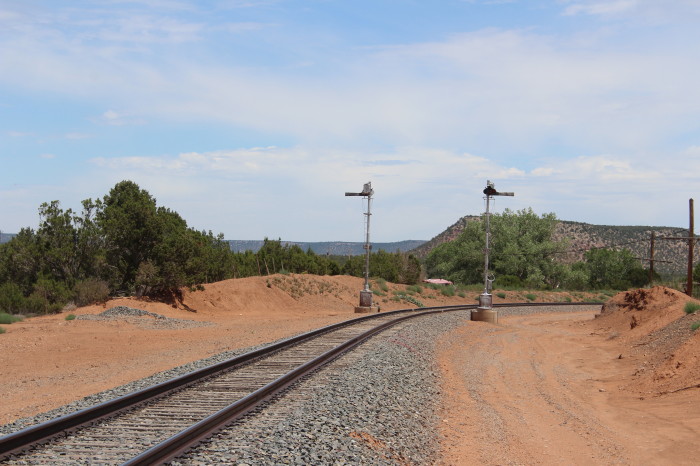 The Southwest Chief splits the semaphores at Colmar, NM.