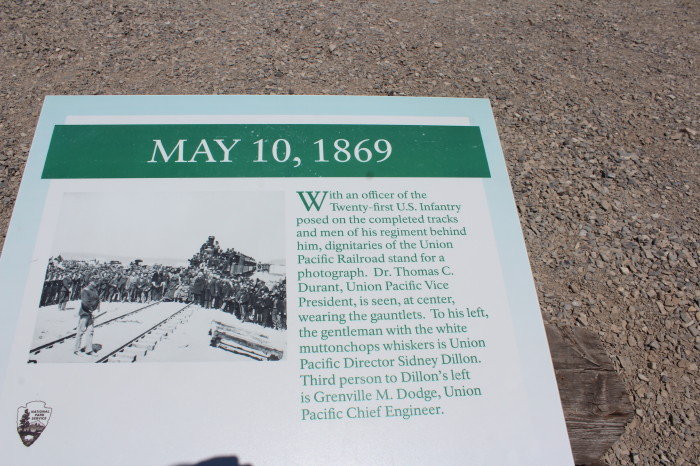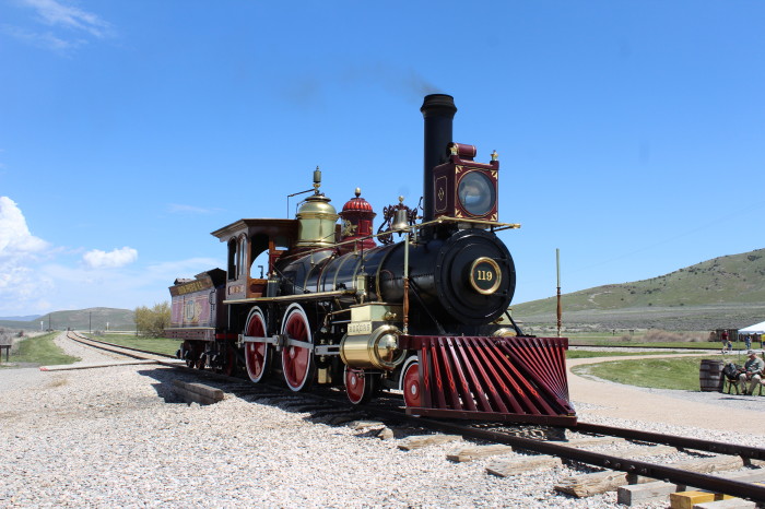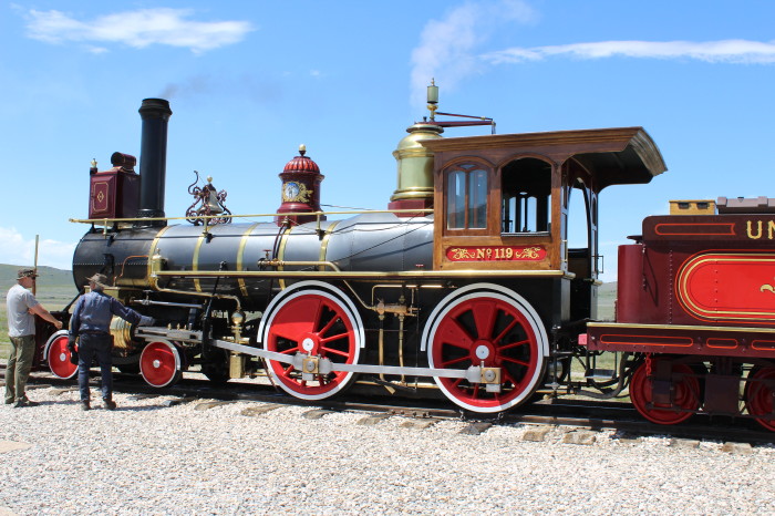 On May 10, in anticipation of the ceremony, Union Pacific No. 119 and Central Pacific No. 60 (better known as the Jupiter) locomotives were drawn up face-to-face on Promontory Summit. It is unknown how many people attended the event; estimates run from as low as 500 to as many as 3,000; government and railroad officials and track workers were present to witness the event. Before the last spike was driven, three other commemorative spikes, presented on behalf of the other three members of the Central Pacific's Big Four who did not attend the ceremony, had been driven in the pre-bored laurel tie: a second, lower-quality gold spike, supplied by the San Francisco News Letter was made of $200 worth of gold and inscribed: With this spike the San Francisco News Letter offers its homage to the great work which has joined the Atlantic and Pacific Oceans. A silver spike, supplied by the State of Nevada; forged, rather than cast, of 25 troy ounces of unpolished silver. A blended iron, silver and gold spike, supplied by the Arizona Territory, engraved: Ribbed with iron clad in silver and crowned with gold Arizona presents her offering to the enterprise that has banded a continent and dictated a pathway to commerce. This spike was given to Union Pacific President Oliver Ames following the ceremony. It is on display at the Union Pacific Railroad Museum in Council Bluffs, Iowa.