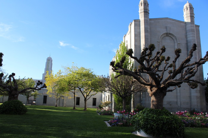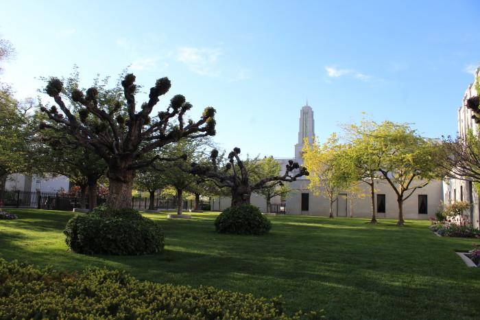 250 flower beds surround the plaza, an oval reflecting pool and a