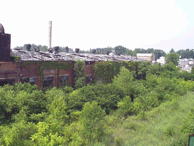 This view shows the area between the north and south erecting shops, where the transfer table is. Despite our best efforts, the vegetation obscures the whole thing. There is a rectangular area in which a piece of track - like a bridge - can move sideways. A car or locomotive can come out one door onto the transfer table, be moved sideways until it lines up with another door, then be moved inside again, or out to the rest of the railroad.