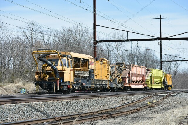 | Running ahead of the TLM are a number of MOW pieces preparing the way. One of the things that has to be done is remove any old concrete ties that might jam the equipment, especially those that may have deteriorated. |