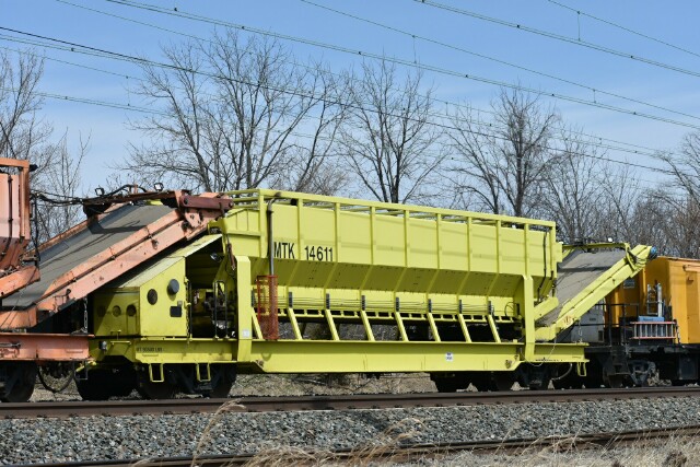 | AMTK 14611 in new MOW yellow. The cars were built by Plasser American specifically for use with ballast cleaner systems and Amtrak owns about two dozen of them. |