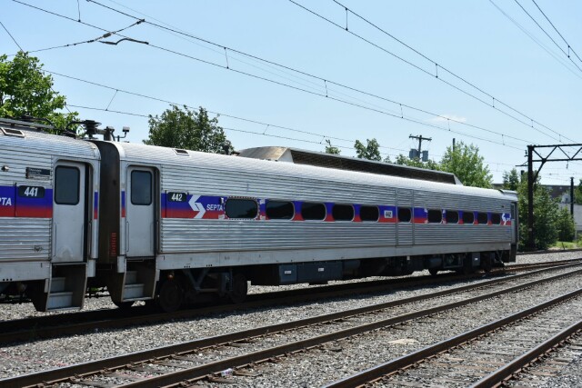 With the retirement of the Silverliner II's and III's, the mantle of oldest SEPTA commuter car in operation was passed to their fleet of GE Silverliner IV's that were acquired between 1973 and 1976 by the Penn Central Railroad and the Reading Company, and as such, have been photographed many times over the years. Being the old kid on the block, it is hard to find a reason to point a camera in their direction. Here are two. With an exterior of stainless steel that will last a lifetime, the Silverliners need no paint to protect them, so when SPAX 442 was spotted on July 14 2018 at Lansdale, it was unusual to say the least. For some unknown reason, the roof of the B end of the married pair has been painted white. |