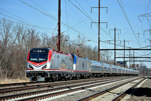 | The 82nd Annual New Jersey State Chamber of Commerce Walk to Washington Charter Train made its round trip run from New York City to Washington DC this week, and was led by ACS-64 AMTK 642, aka the Veterans' unit, in the bright sunshine at Eddington Station. |